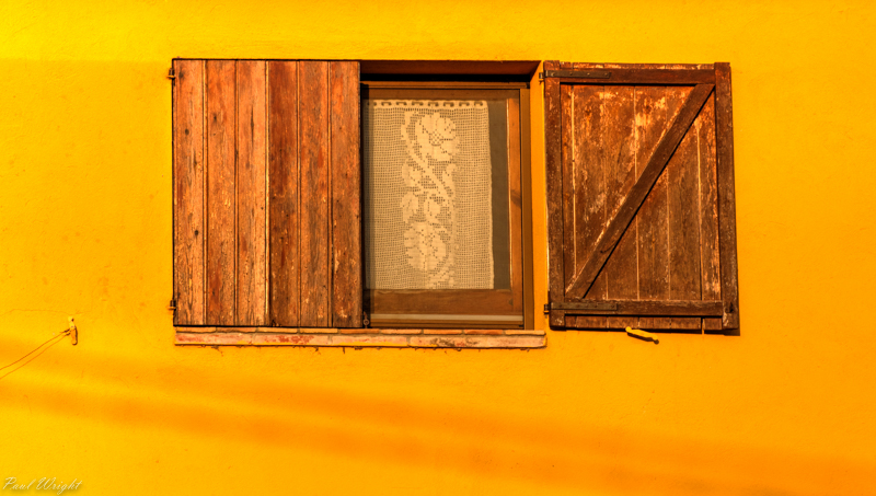 Colourful window high in an old building near Can Fabrica, near Banyoles, Spain