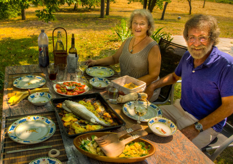 Marta and Ramon sit down to a late lunch, Can Fabrica, near Banyoles, Spain