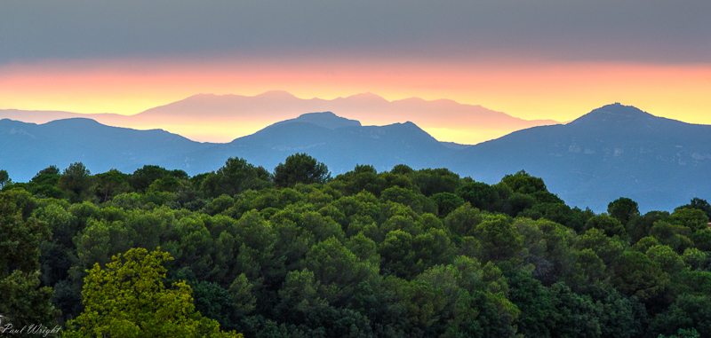 View of the distant Pyranees in the evening light, Can Fabrica, near Banyoles, Spain
