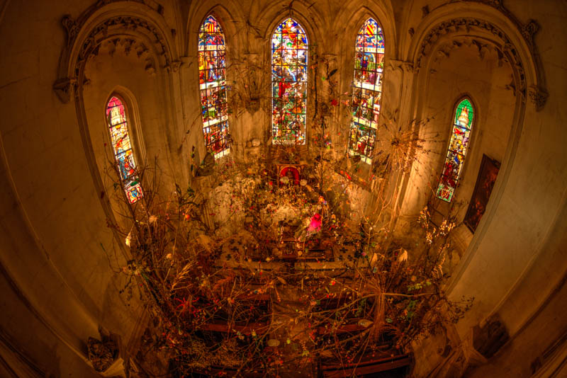 Chapel with colourful windows and filled with branches, Chateau de Chaumont, Loire Valley, France