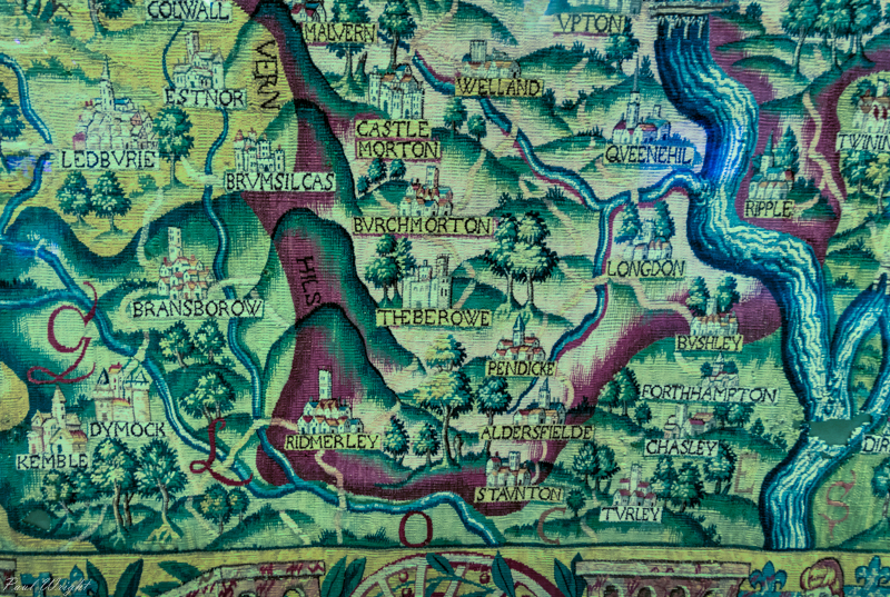 Restored tapestry with a sixteenth century map of Worcestershire in the Weston Library, Oxford, UK