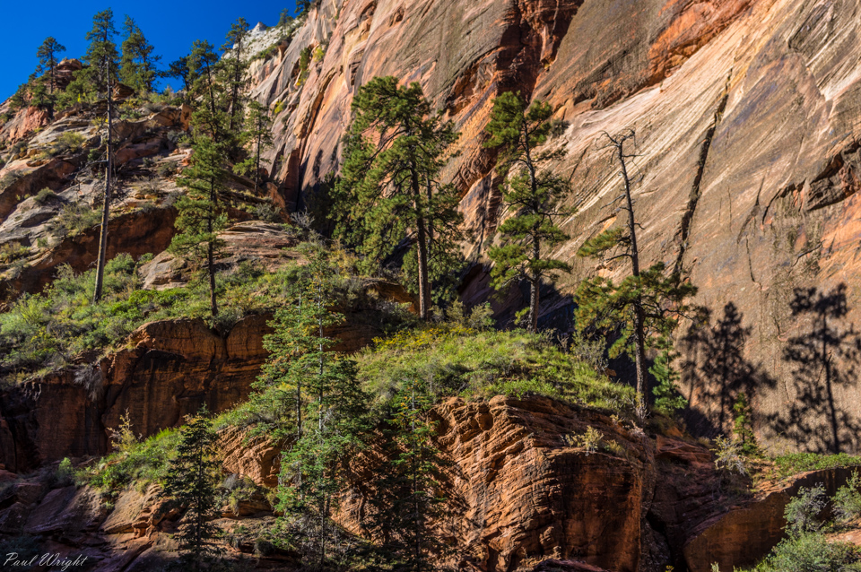 Tall trees and rock walls near Scout's Landing, Zion National Park, Utah