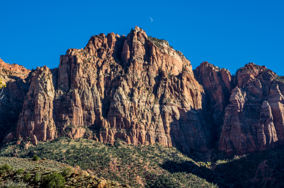 Crescent moon over the mountains, Zion National Park, Utah